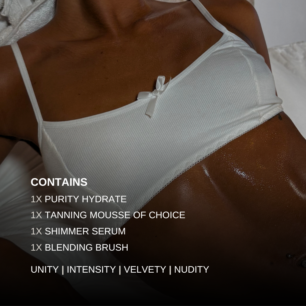 - Purity Hydrate - The secret weapon against dry elbows and knees. This oil-free mist saturates the skin with moisture before you tan, creating a smooth barrier that prevents the tan from 'grabbing' onto dry patches.
