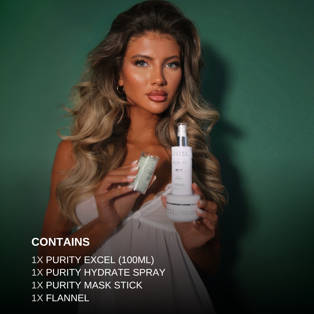 • Purity Excel (100ml): Our award-winning 60-second tan remover in a convenient mini size. It effortlessly melts away stubborn tan and impurities.